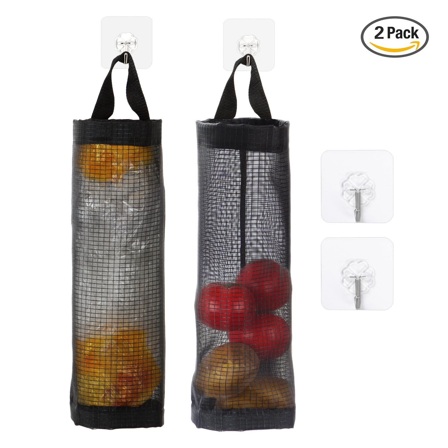 9. 2 Pieces Plastic Bag Holder Hanging Folding Mesh Garbage Bag Organizer Waste Bag Storage Trash Bags Dispenser with Hooks (Black)